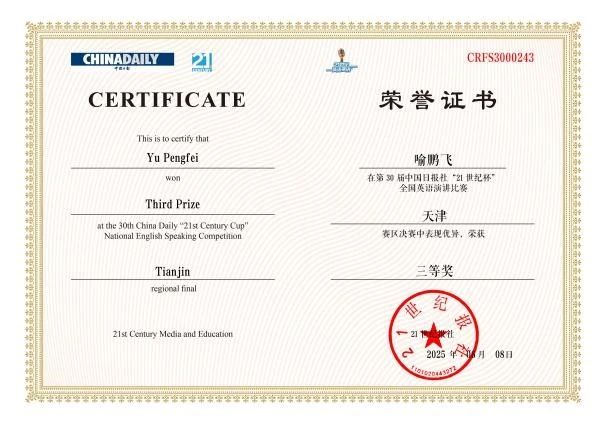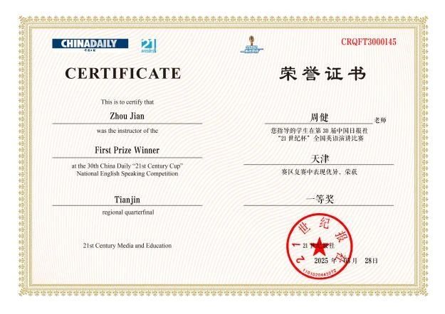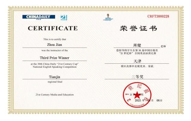 近日,由中国日报社指导、21世纪英语教育传媒主办的2025年第30届中国日报社“21世纪杯”全国英语演讲比赛天津地区复赛、决赛成功举办。由我院教师周健指导的22级翻译专业喻鹏飞在众多参赛选手中脱颖而出,获天津赛区复赛一等奖、决赛获三等奖。