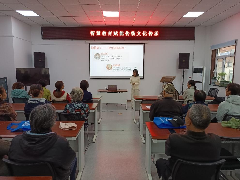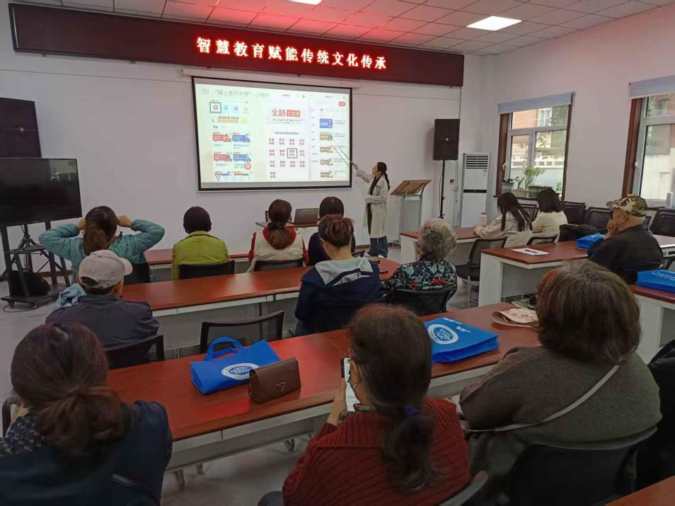 李霞老师做了“云端共学:智慧教育赋能传统文化传承”的主题报告,为社区居民推介了如国家老年大学、红松学习课堂等多个智慧教育云课堂,以简单、直白的方式逐步演示了云课堂的具体操作方法,如,如何进入官网和小程序,注册登录、搜索感兴趣的文化课程,并报名参与学习。李老师还向居民朋友们展示了如书法、茶文化、太极剑等传统文化课程内容及相关视频,极大地激发了听众的兴趣和参与热情。